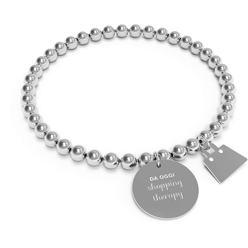 Bracciale Da Donna Di 10 Buoni Propositi By Annabiblo° Della Collezione Mini. Gioiello Caratterizzato Dall'Incisione Di Uno Dei Buoni Propositi. Bracciale Con La Scritta Da Oggi Shopping Therapy. Gioiello In Acciaio Inossidabile Aisi 304 Anallergico E Sfere 4Mm In Acciaio. Gioiello Con Medaglia In Acciaio Di 15Mm Con Inciso Il Buon Proposito E Sul Retro Il Marchio Annabiblo° E Ciondolo A Forma Dell'Icona Corrispondente. Bracciale Montato Su Elastico Della Lunghezza Di Cm 17.