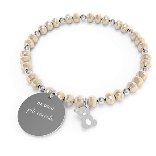 Bracciale Da Donna Di 10 Buoni Propositi By Annabiblo° Della Collezione Crystal. Gioiello Caratterizzato Dall'Incisione Di Uno Dei Buoni Propositi. Bracciale Con La Scritta Da Oggi Più Coccole. Gioiello In Acciaio Inossidabile Anallergico, Sfere 4Mm In Acciaio E Rondelle Di Cristallo 6 Mm. Gioiello Con Medaglia In Acciaio Di 15 Mm Con Inciso Il Buon Proposito E Sul Retro Il Marchio Annabiblo° E Ciondolo A Forma Dell'Icona Corrispondente. Gioiello Di Colore Silver E Champagne. Bracciale Montato Su Elastico Della Lunghezza Di Cm 17