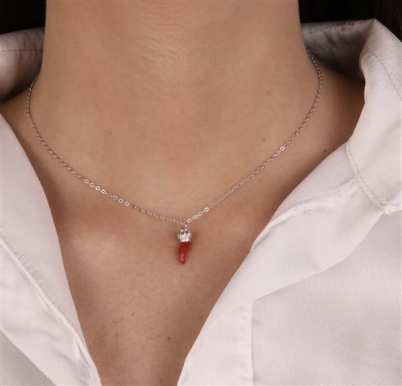 Collana in Argento 925 con corno rosso e zirconi bianchi