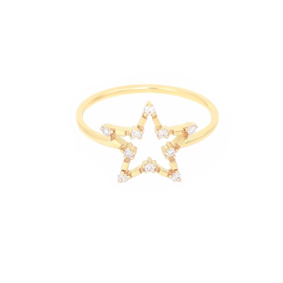 Anello Etoile in oro giallo 18 carati con stella centrale. La stella misura 12 mm x 12 mm e sulla sua superficie sono presenti diamanti di colore bianco. I diamanti naturali presentano le seguenti caratteristiche di qualità. Colore: G+ Purezza: sì L'anello è disponibile in tre misure IT: 10, 13 e 16. La misura IT 10 indica una circonferenza di 50 mm. La misura IT 13 indica una circonferenza di 53 mm. La misura IT 16 indica una circonferenza di 56 mm.
