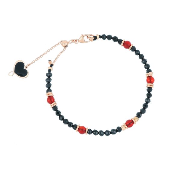 Bracciale realizzato in argento 925 con galvanica oro rosa ad alto spessore e resistenza. Sono presenti Spinelli e Corniole con piccole sfere e cerchietti. Il bracciale può essere regolato da un minimo di 15 cm fino ad un massimo di 19 cm grazie alla piccola sfera scorrevole. Inoltre è presente il cuore Maman smaltato di nero. Chiusura a moschettone.