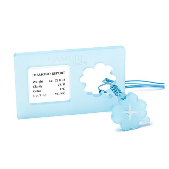 Cofanetto composto da un blister di plexiglass in cui è inserito il diamante, che può essere staccato e diventare una graziosa collana. All’interno della confezione è compresa anche una pasta modellante per le impronte dei piedini e delle manine del bambino.