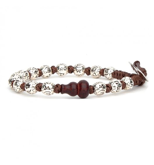 Braccialetto realizzato con cordino marrone e sfere in argento 925% dal diametro di 6 mm con inciso il mantra "Om Mani Padme Hūm". Misura estremamente regolabile. I bracciali Tamashii sono bracciali originali tibetani chiamati anche Shamballa realizzati in pietre naturali. Ogni bracciale donna e bracciale uomo ha come elemento "La Calabash" una zucca piena di semi fatta in legno come simbolo della continuità della vita e della felicità.