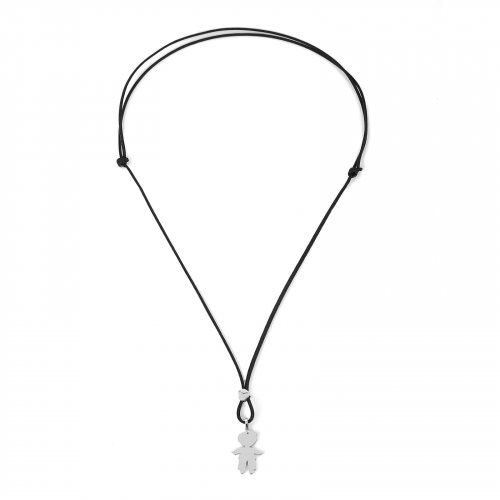 Pendente medio a forma di bimbo in oro bianco 9kt e saliscendi a forma di cuore. La collana è costituita da un cordino nero in poliestere riciclato regolabile. La sagoma di bimbo, il cuore ed il cordino senza punti di apertura, simboleggiano l'amore per i figli e la famiglia, legami che non si rompono, non si piegano né si spezzano, indissolubili e senza confini.