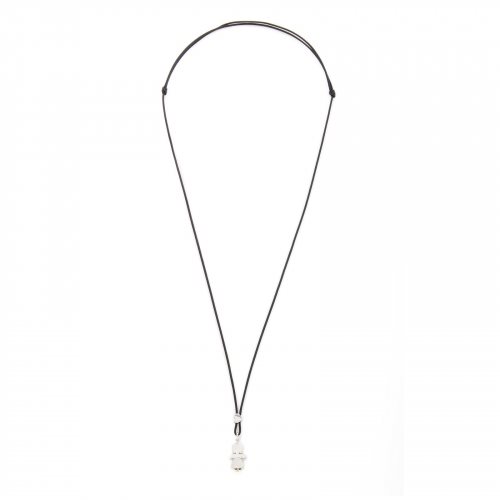 Pendente medio a forma di bimba in oro bianco 9kt e madreperla con saliscendi a forma di cuore. La collana è costituita da un cordino nero in poliestere riciclato regolabile. La sagoma di bimba, il cuore ed il cordino senza punti di apertura, simboleggiano l'amore per i figli e la famiglia che non si rompe, non si piega né si spezza, indissolubile, infinito.