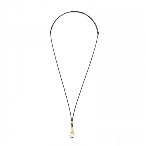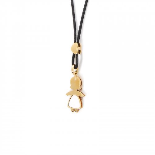 Pendente medio a forma di bimba in oro 9kt e madreperla con saliscendi a forma di cuore. La collana è costituita da un cordino nero in poliestere riciclato regolabile. La sagoma di bimba, il cuore ed il cordino senza punti di apertura, simboleggiano l'amore per i figli e la famiglia che non si rompe, non si piega né si spezza, indissolubile, infinito.